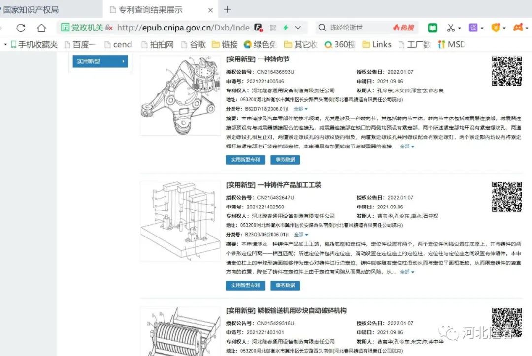 近日,據(jù)國(guó)家知識(shí)產(chǎn)權(quán)局網(wǎng)站公告顯示,河北隆春通用設(shè)備制造有限責(zé)任公司獲得多項(xiàng)專(zhuān)利授權(quán), 其中實(shí)用新型專(zhuān)利包括一種轉(zhuǎn)向節(jié)、一種鑄件產(chǎn)品加工工裝、鱗板輸送機(jī)用砂塊自動(dòng)破碎機(jī)構(gòu)、一種垂直分型制芯機(jī)砂芯內(nèi)嵌冷鐵芯盒結(jié)構(gòu)等多項(xiàng)專(zhuān)利。